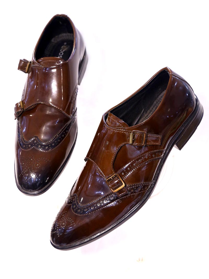 Brown Artificial Leather shinning Formal shoes having side Buckle closure, regular heel and cushioned footbed.