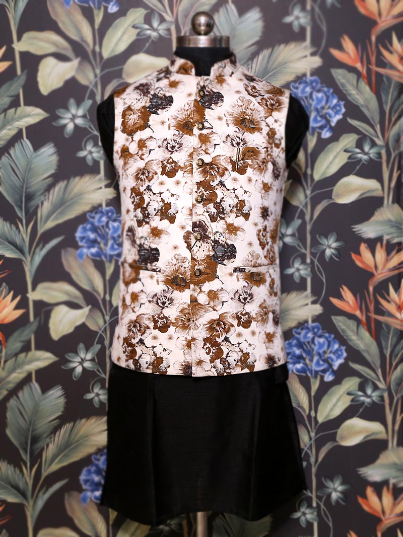 This regular fit ethnic Black Silk Kurta Pajama, along with Cream Floral Waistcoat and a pocket square gives you a unique look.