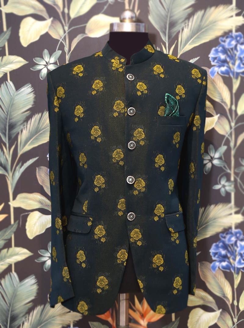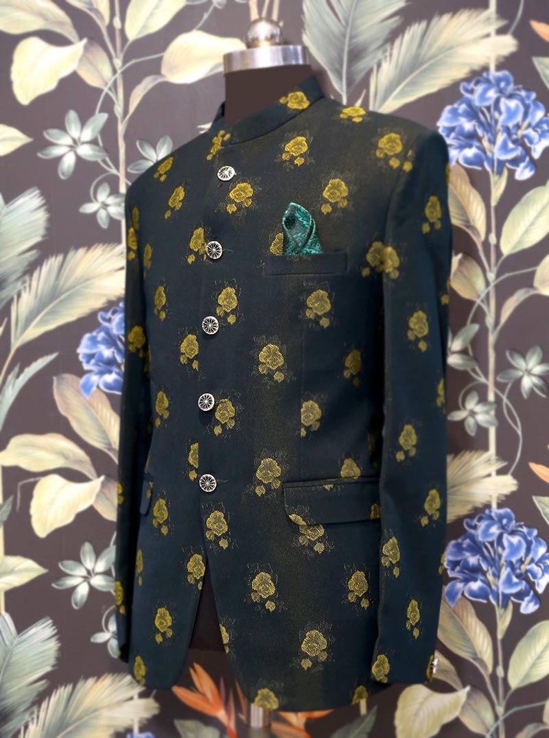 Bottle Green color full sleeved mandarin collared art silk Indo Western has been crafted with floral digital printed design, pocket square and fancy buttons.