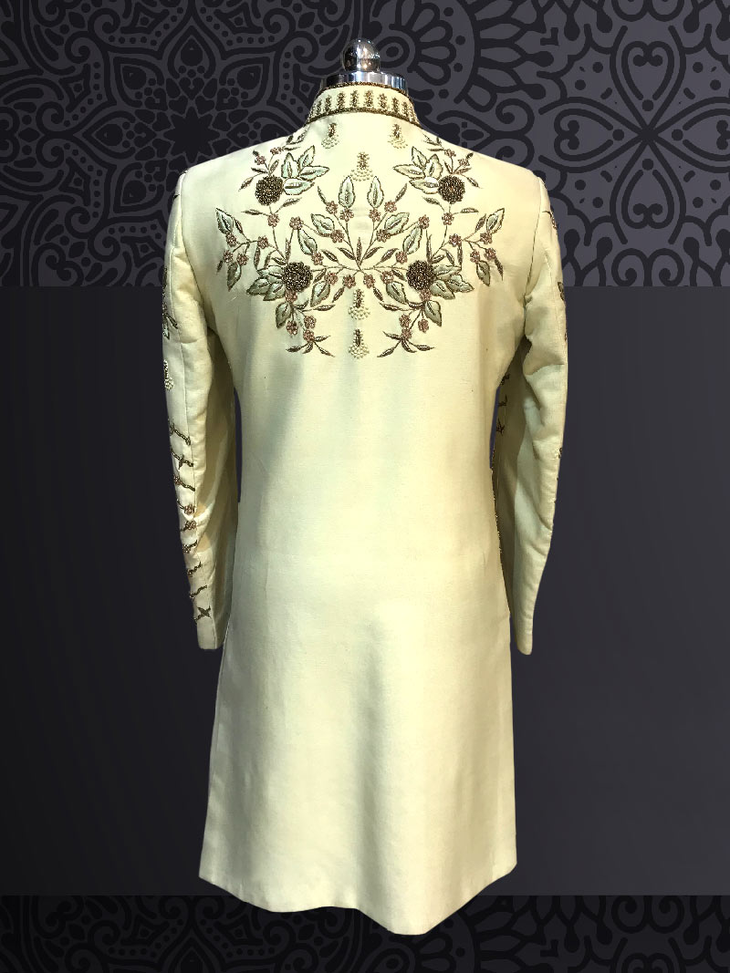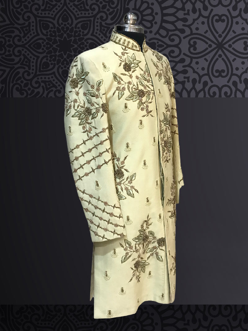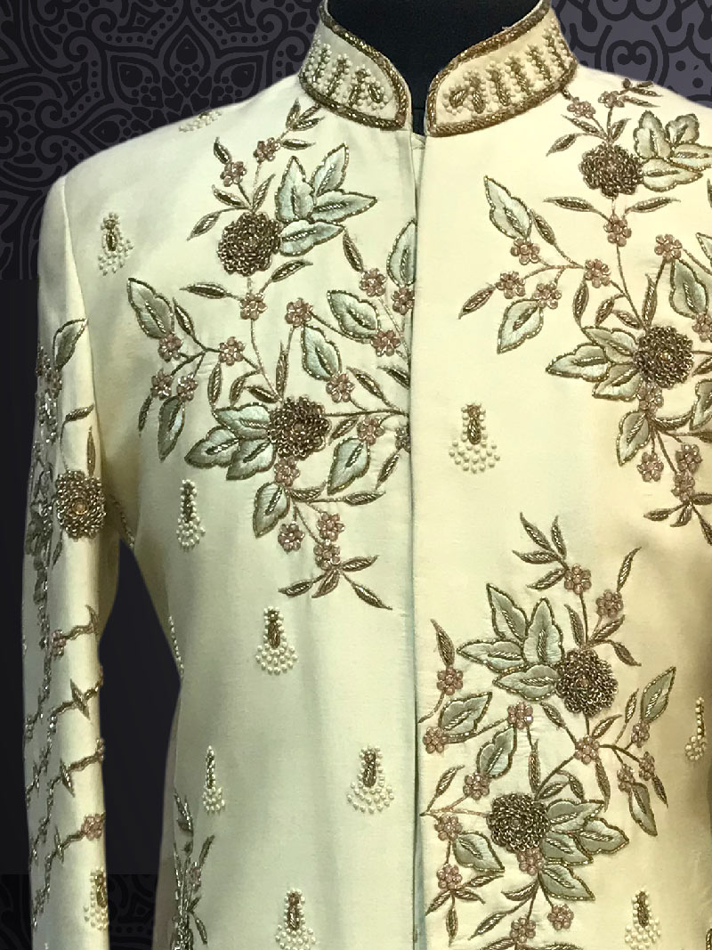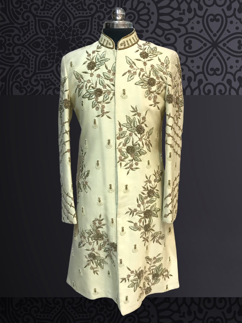 If you are looking for wedding outfit thatt looks delicate yet elgant try for this dictinct pista green sherwani. It is enhanced with hand work and dabka embroidered and embroidered mandarin collar.