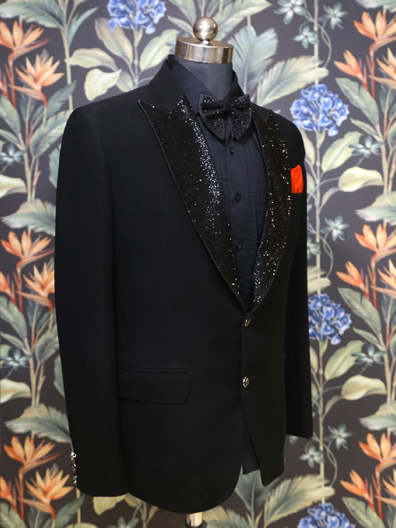 Get this unique Black Suit with beautifully hand work crafted Collar, adorned with matching Bow. This suit comes with Black Pintex Shirt, Pant and Satin Pocket Square.